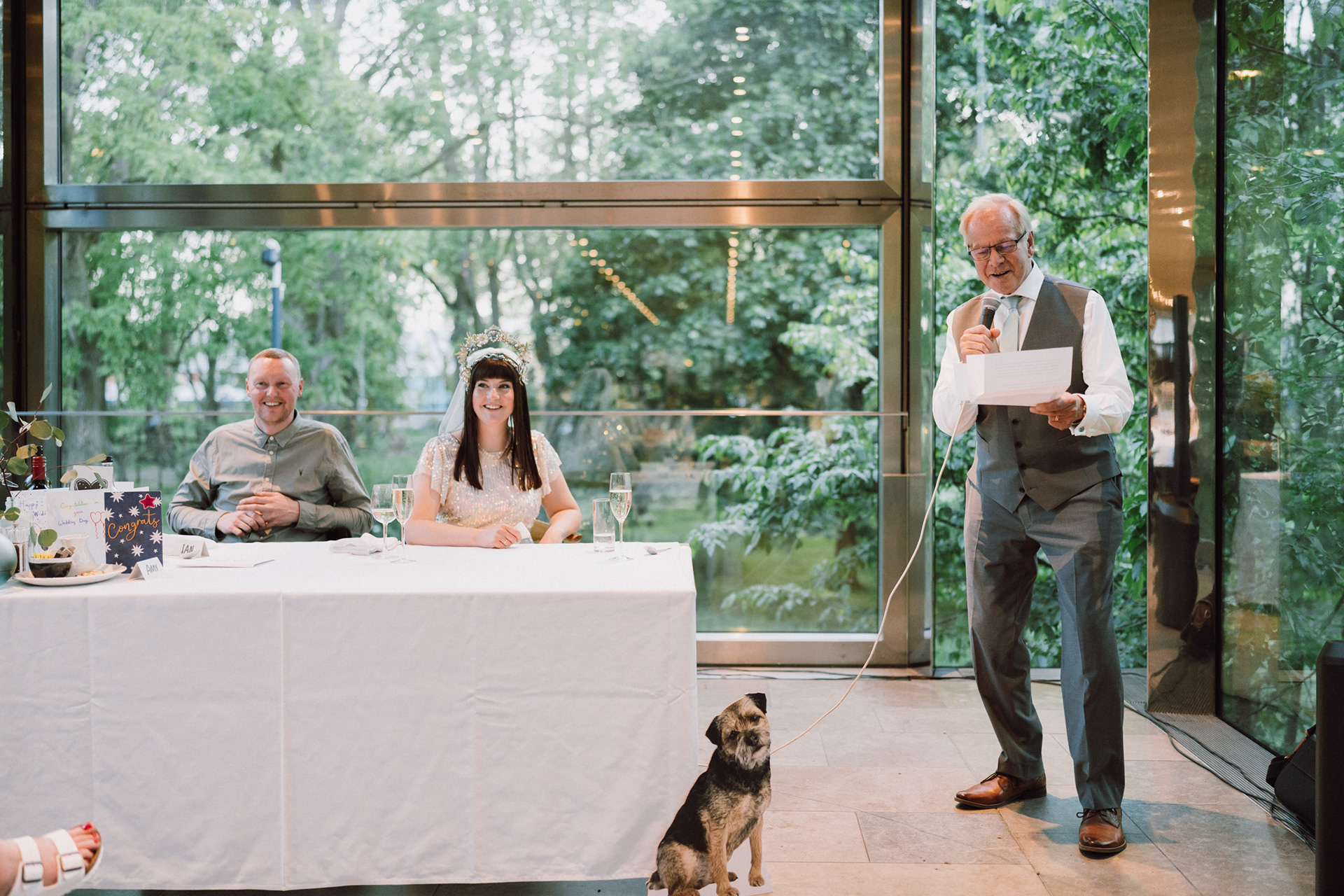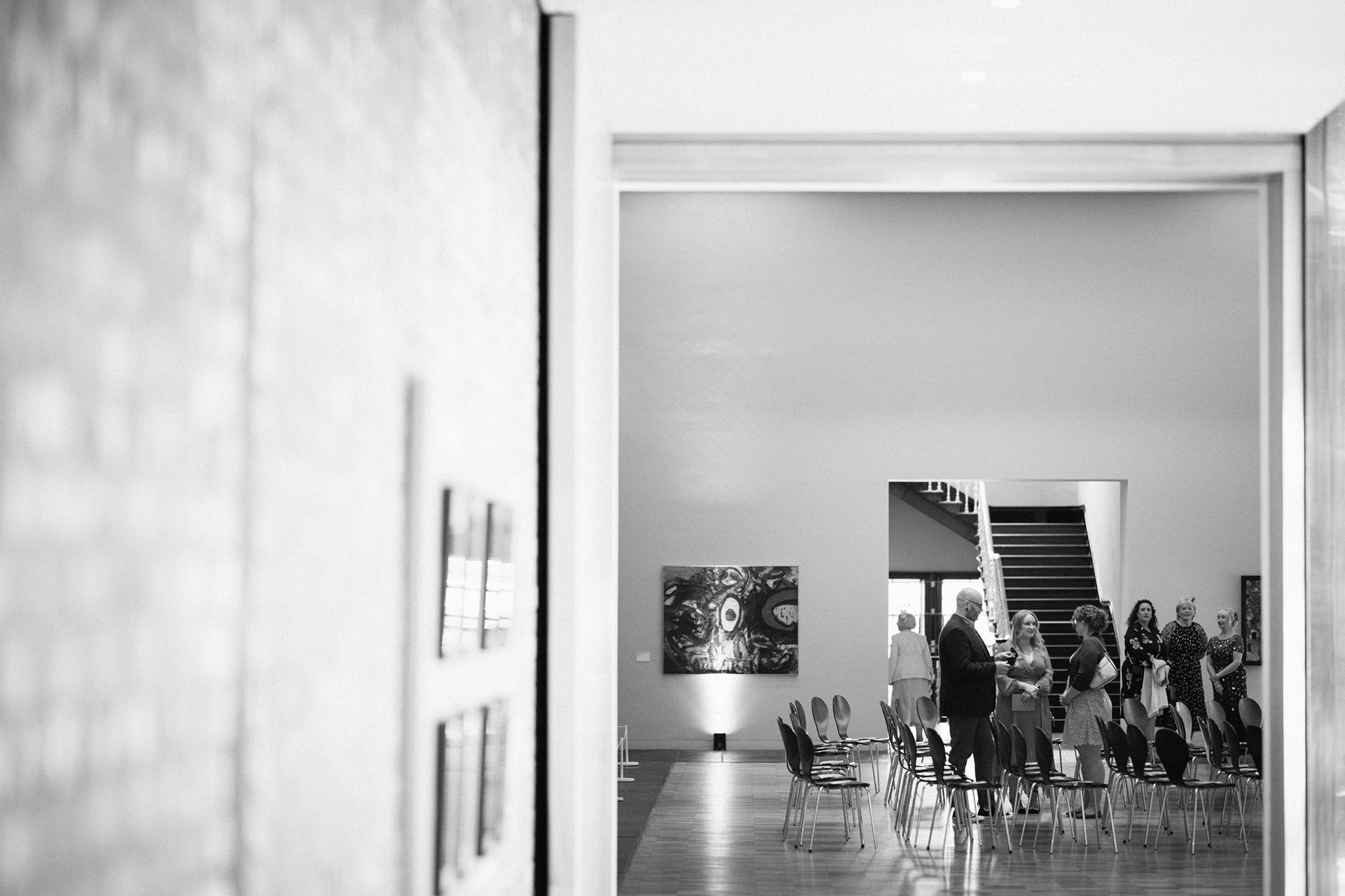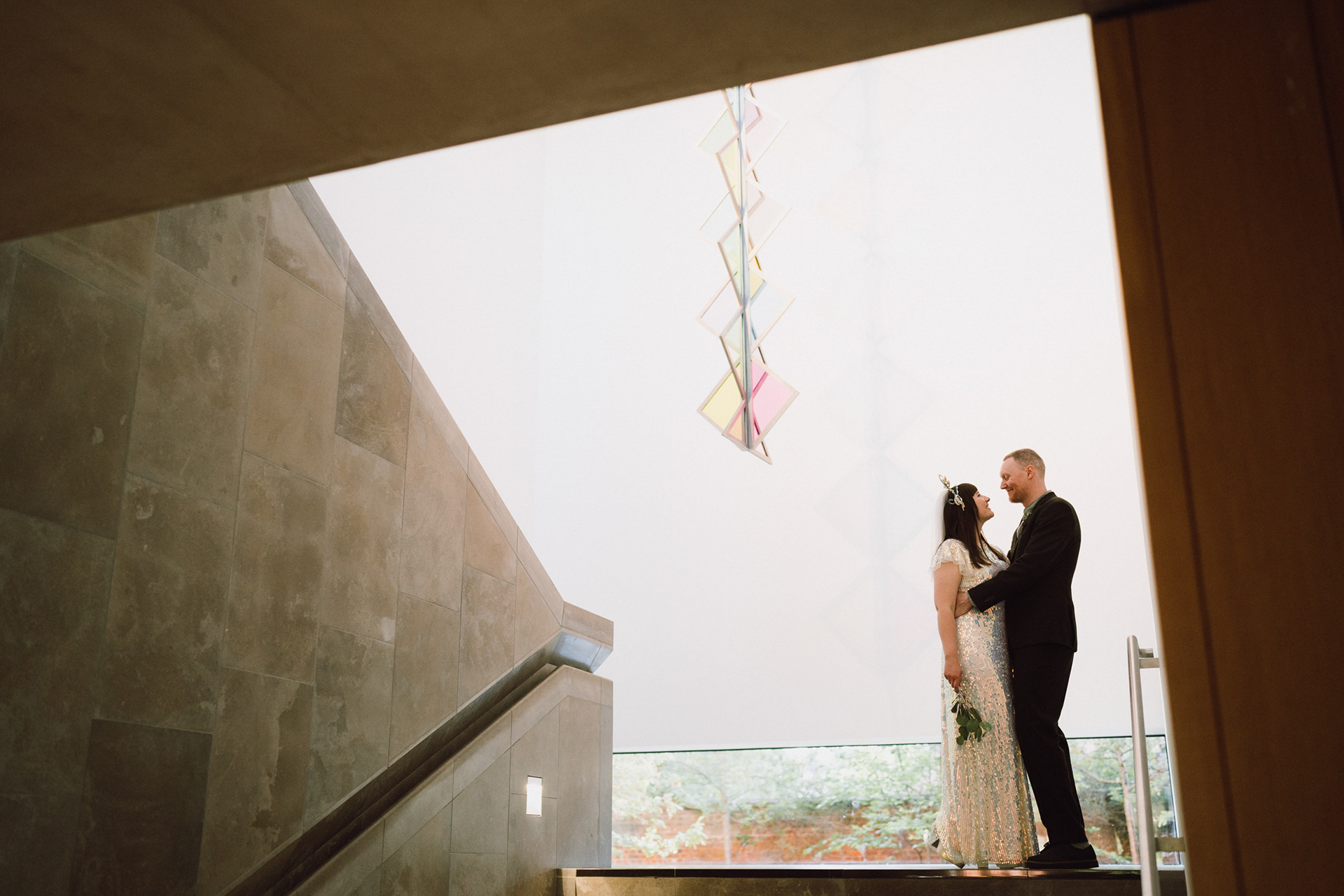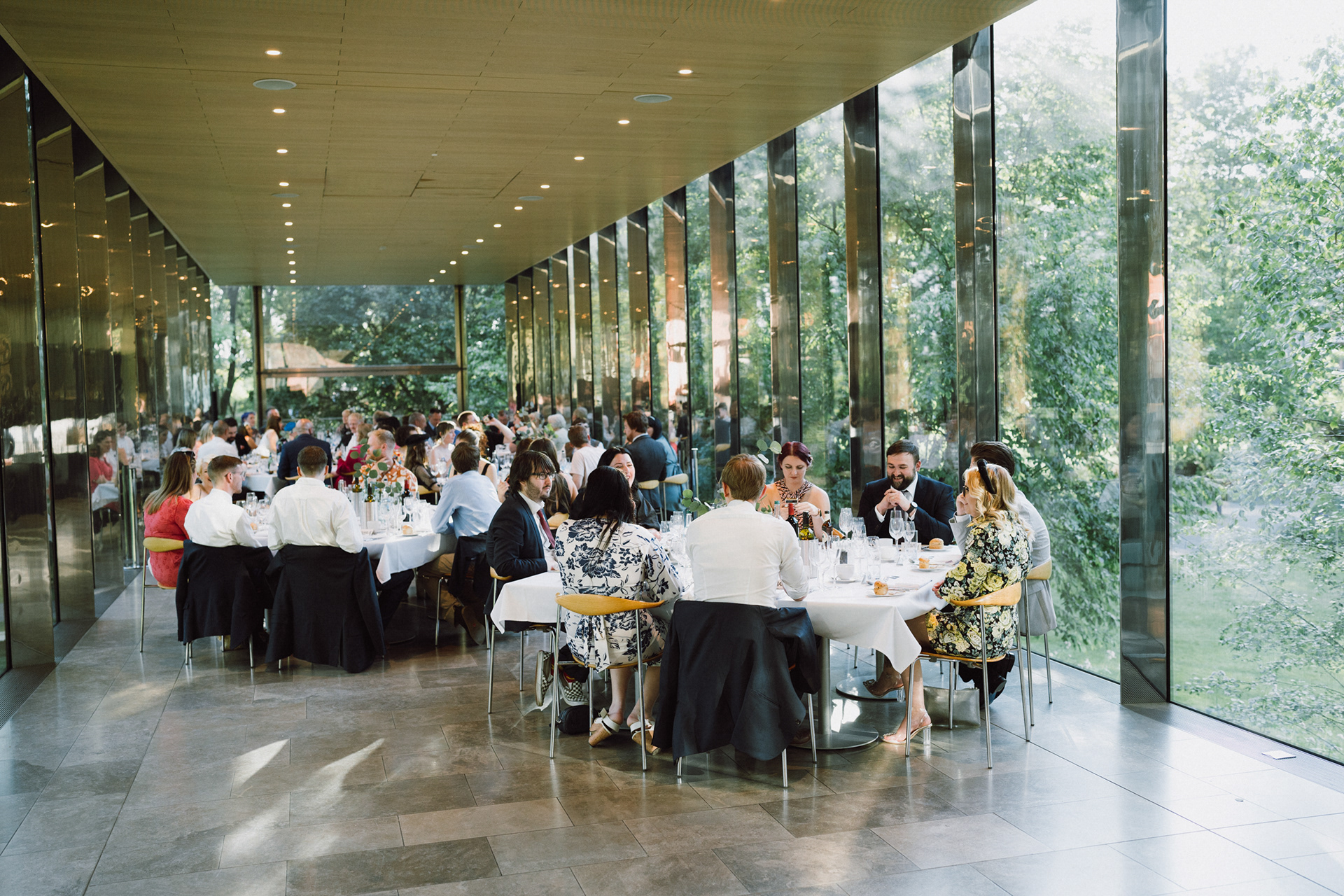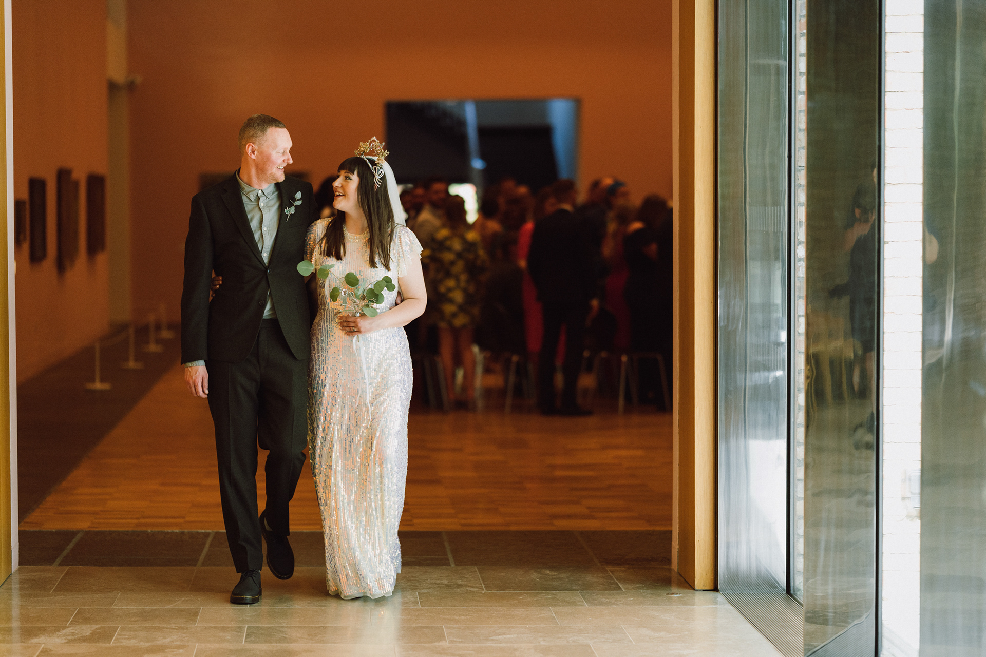The park adjacent to the Gallery offers a convenient and picturesque environment. We were lucky enough to have the sun bouncing off the reflective steel of one of the sculptures next to the building, creating a puddle of brilliant light for Amy and Ian to be photographed in. The impressive glazed dining room played host to an incredible meal alongside heart felt and humourous speeches before the dancing got underway.