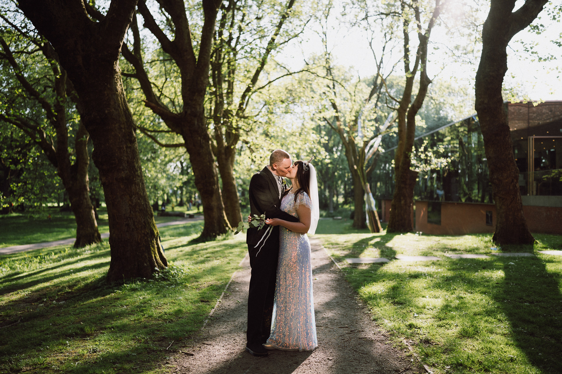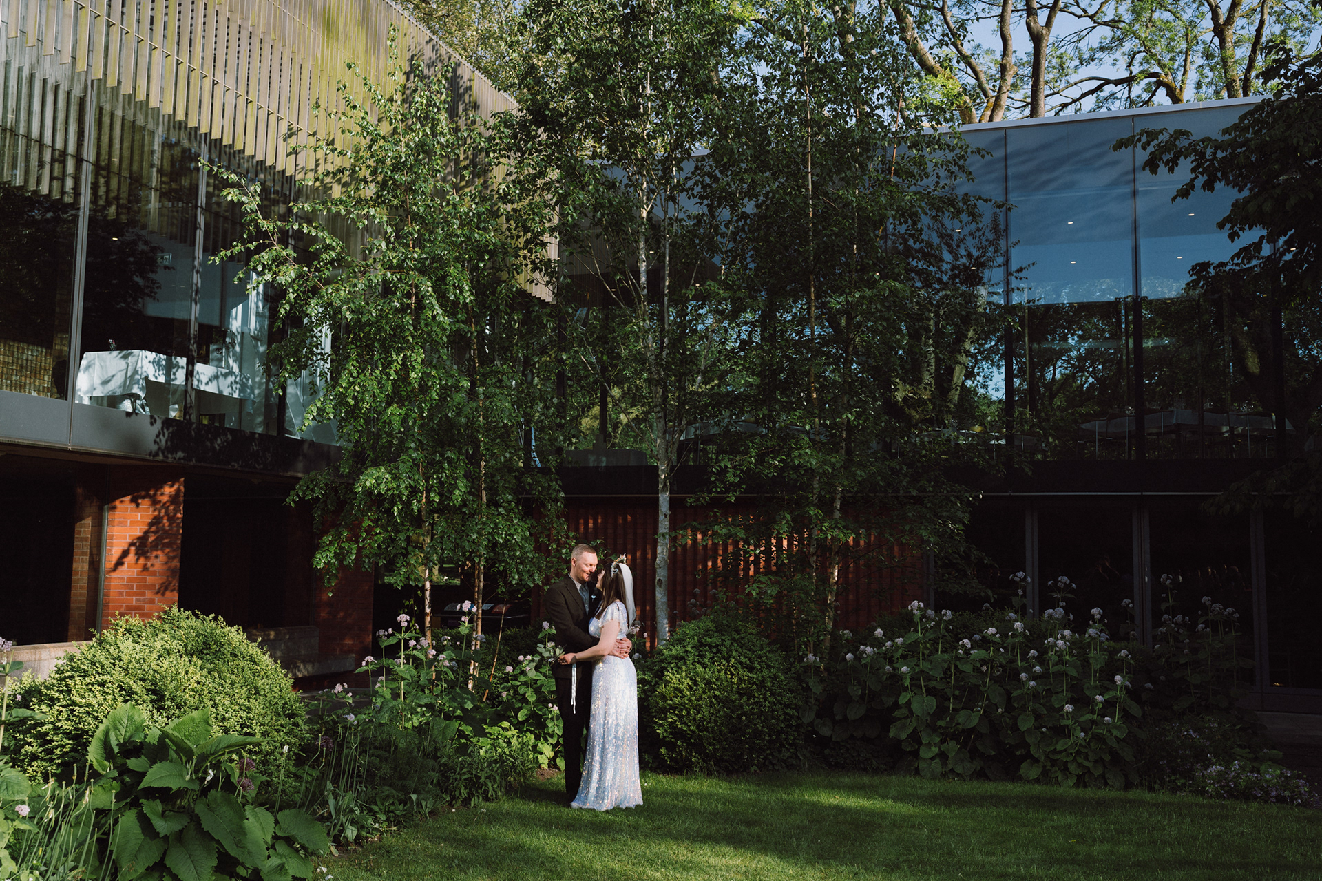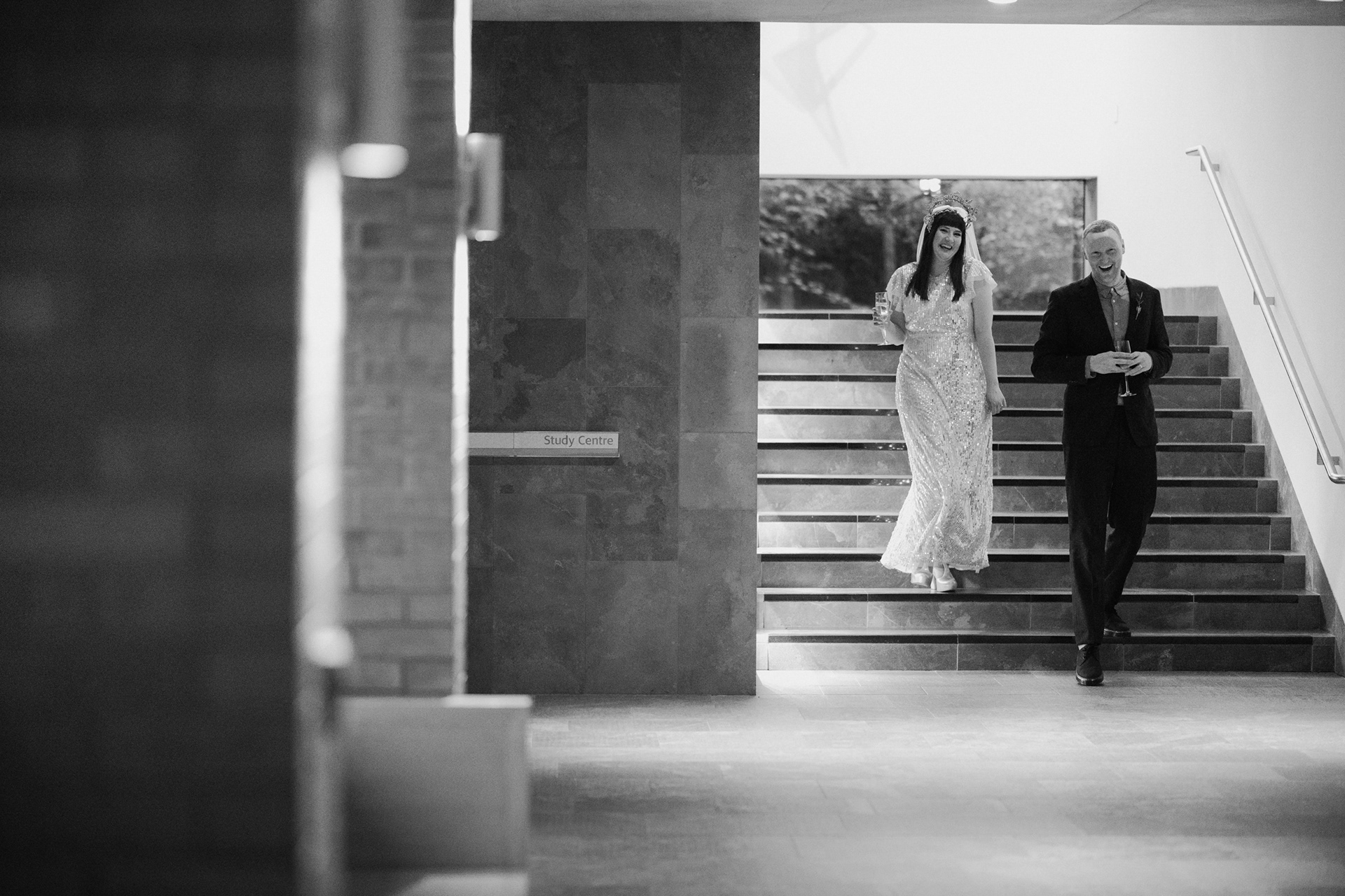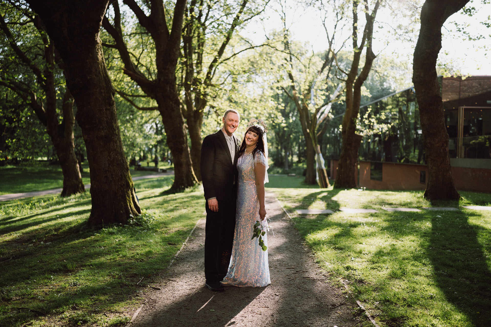 The park adjacent to the Gallery offers a convenient and picturesque environment. We were lucky enough to have the sun bouncing off the reflective steel of one of the sculptures next to the building, creating a puddle of brilliant light for Amy and Ian to be photographed in. The impressive glazed dining room played host to an incredible meal alongside heart felt and humourous speeches before the dancing got underway.