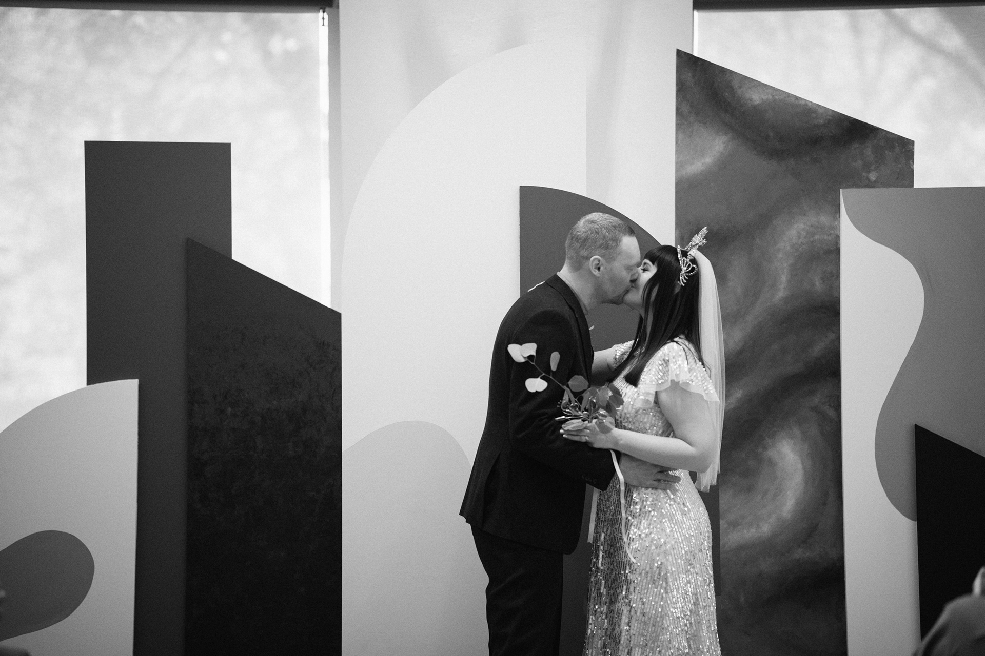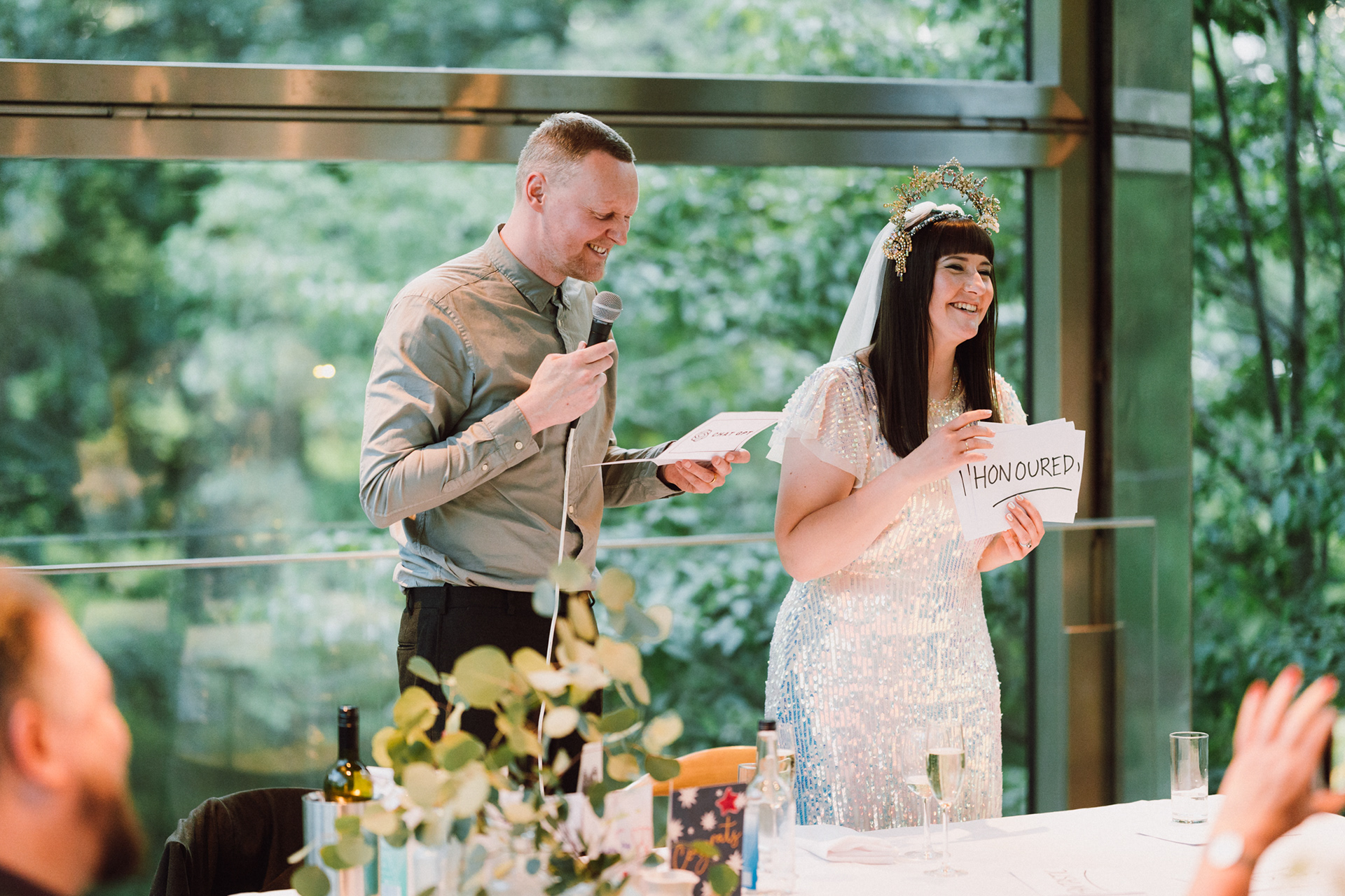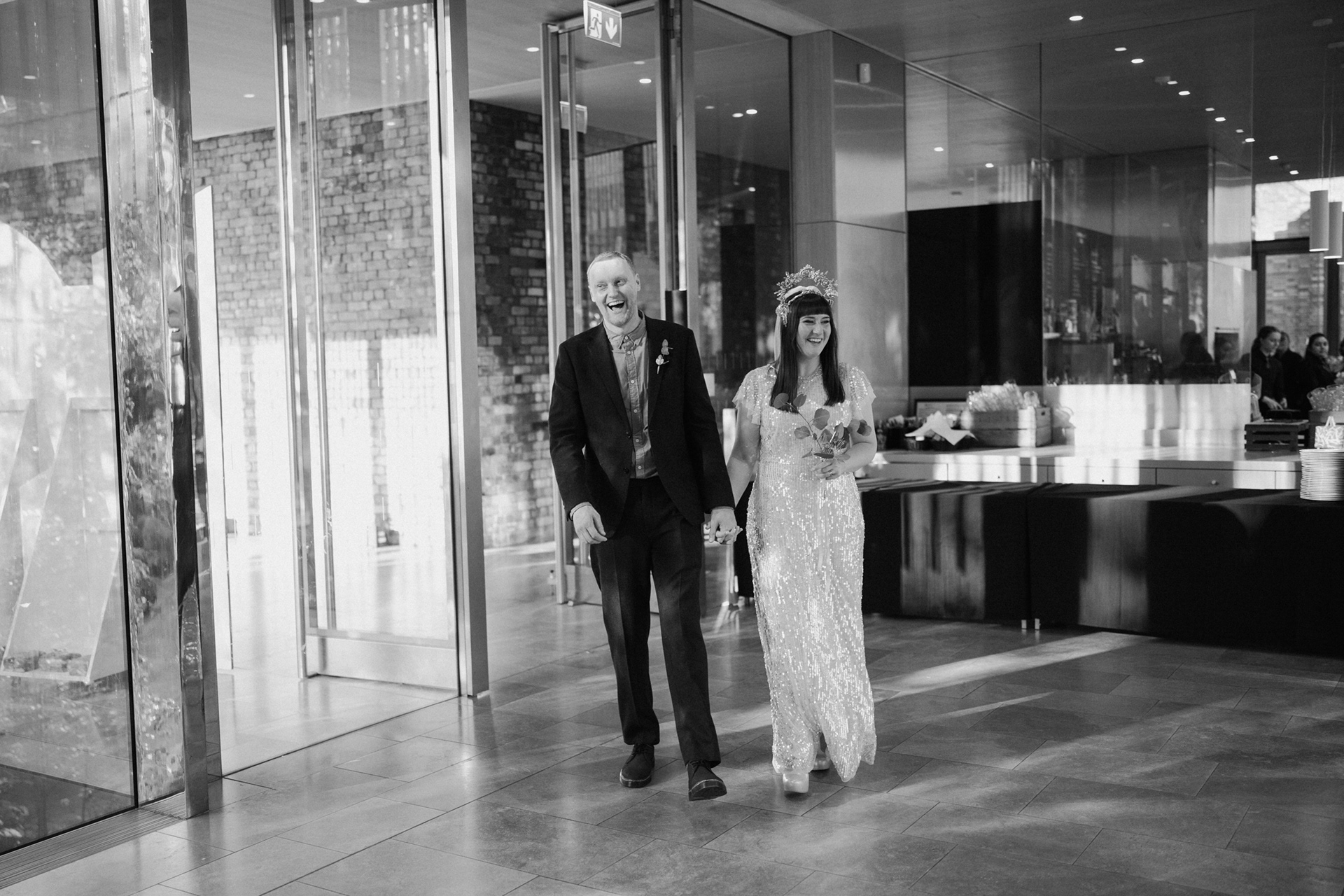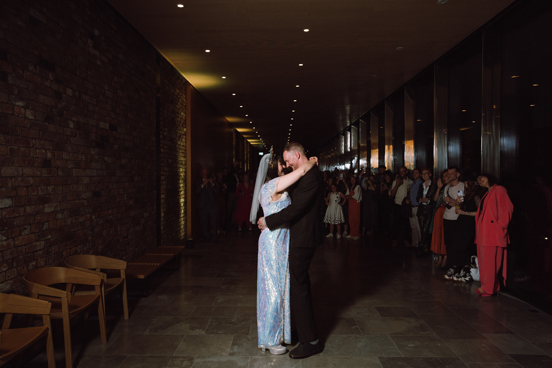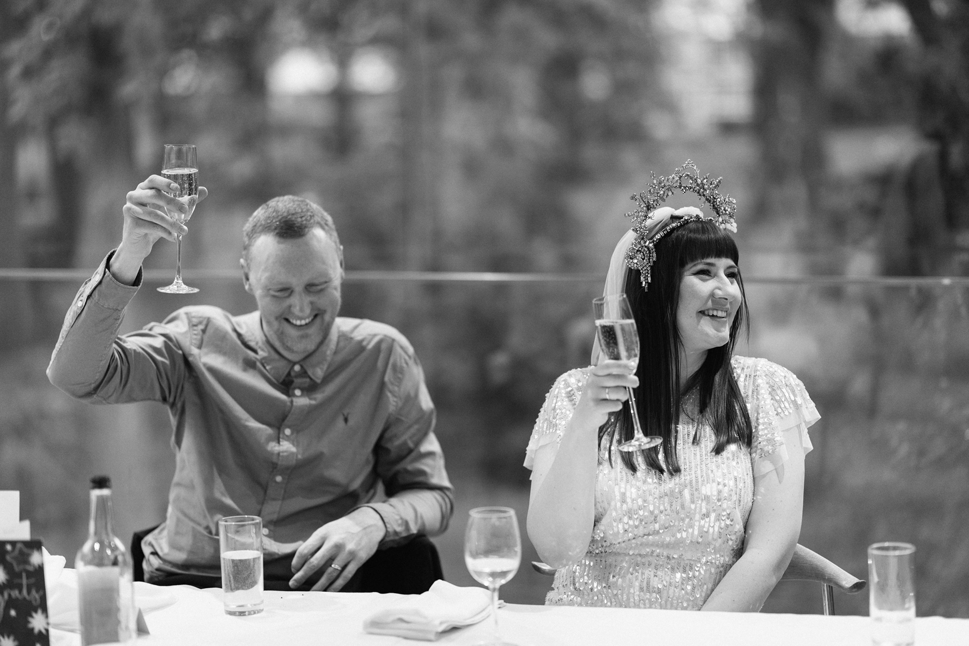 The park adjacent to the Gallery offers a convenient and picturesque environment. We were lucky enough to have the sun bouncing off the reflective steel of one of the sculptures next to the building, creating a puddle of brilliant light for Amy and Ian to be photographed in. The impressive glazed dining room played host to an incredible meal alongside heart felt and humourous speeches before the dancing got underway.