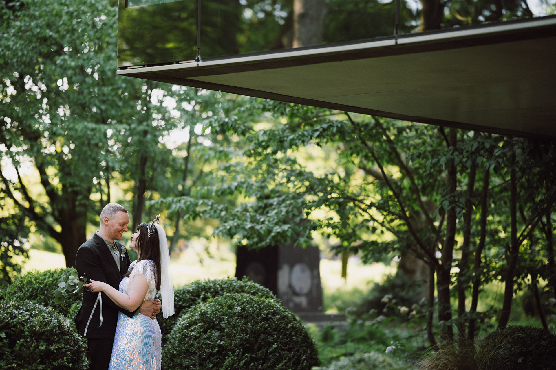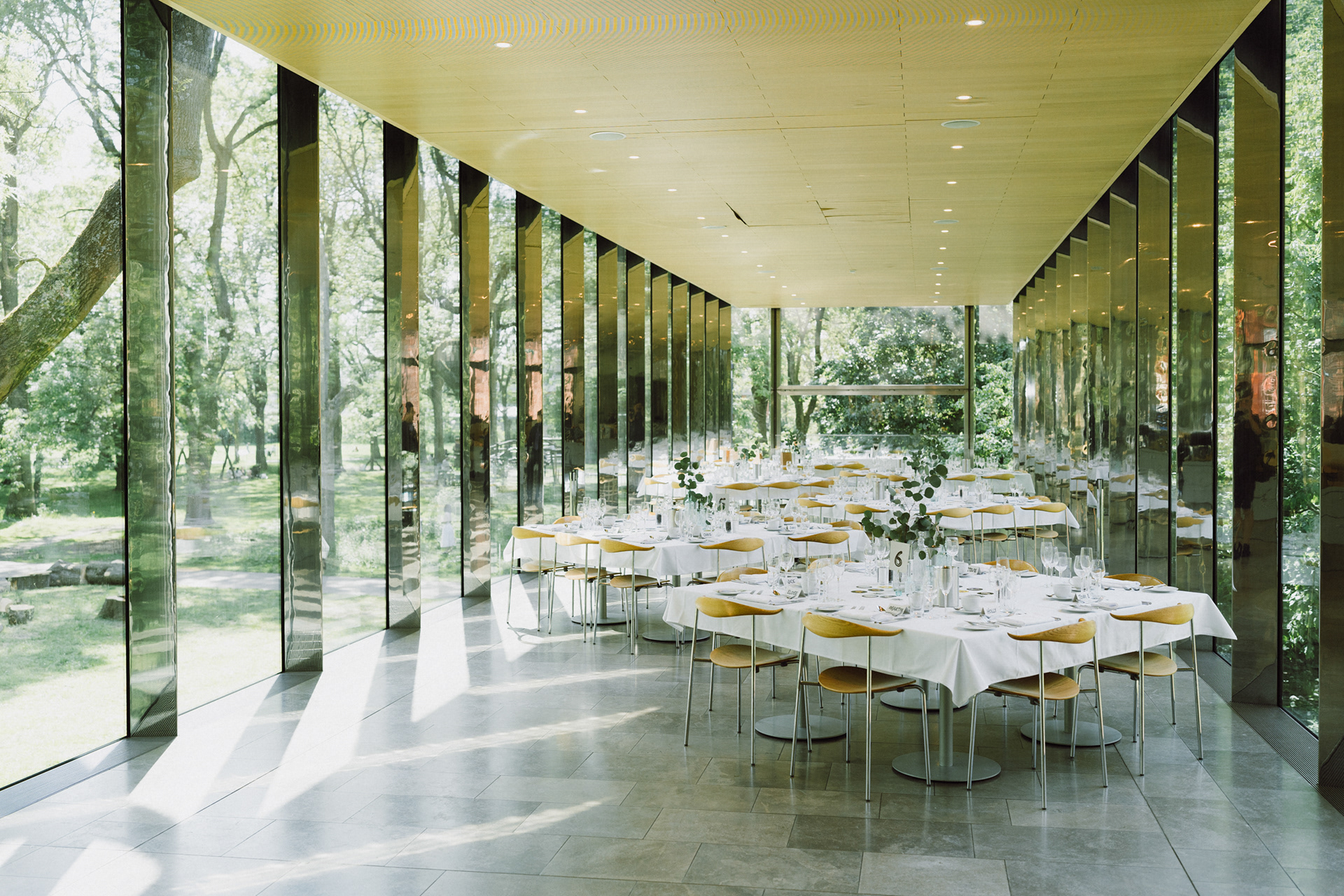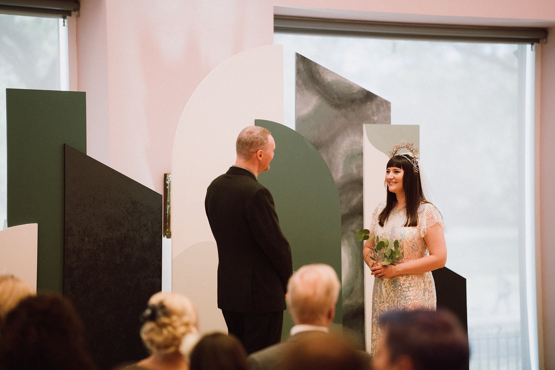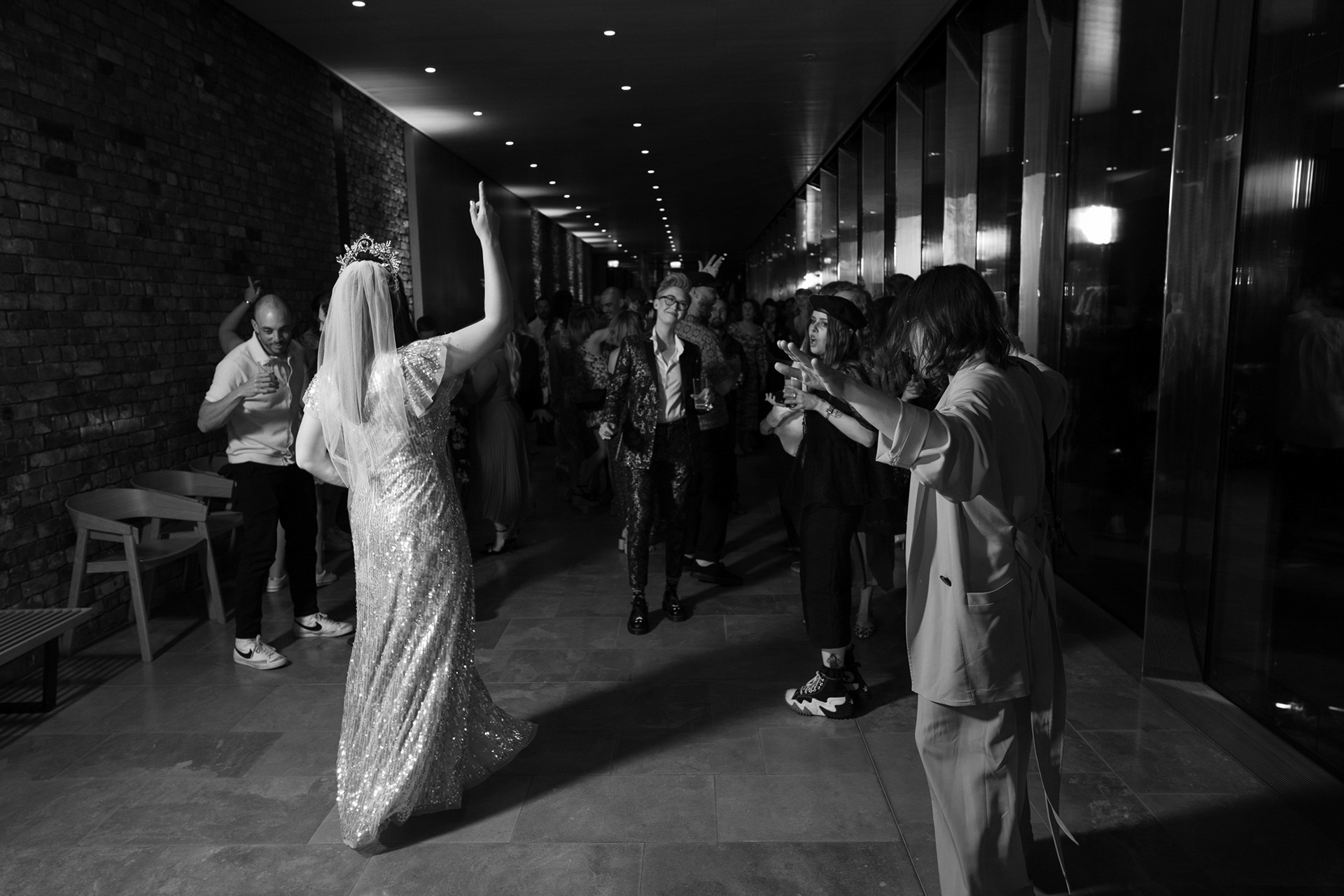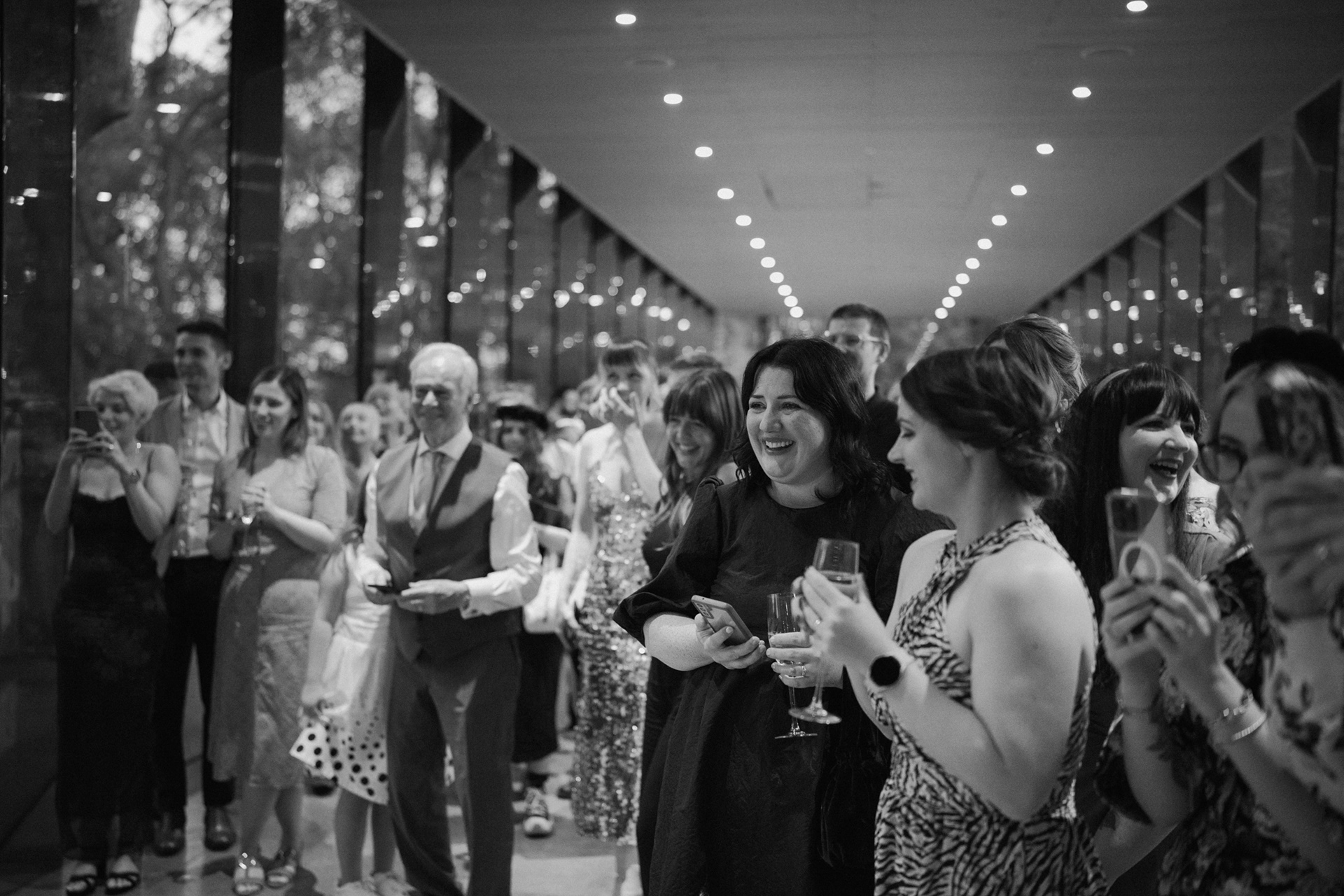 The park adjacent to the Gallery offers a convenient and picturesque environment. We were lucky enough to have the sun bouncing off the reflective steel of one of the sculptures next to the building, creating a puddle of brilliant light for Amy and Ian to be photographed in. The impressive glazed dining room played host to an incredible meal alongside heart felt and humourous speeches before the dancing got underway.