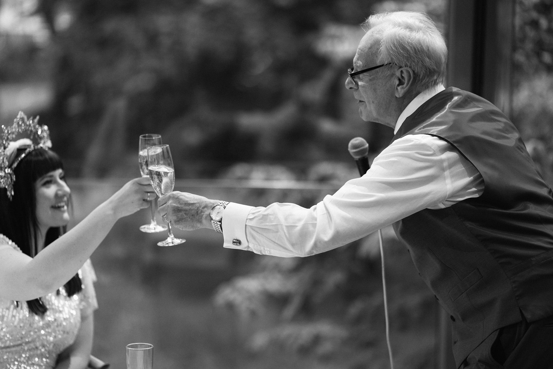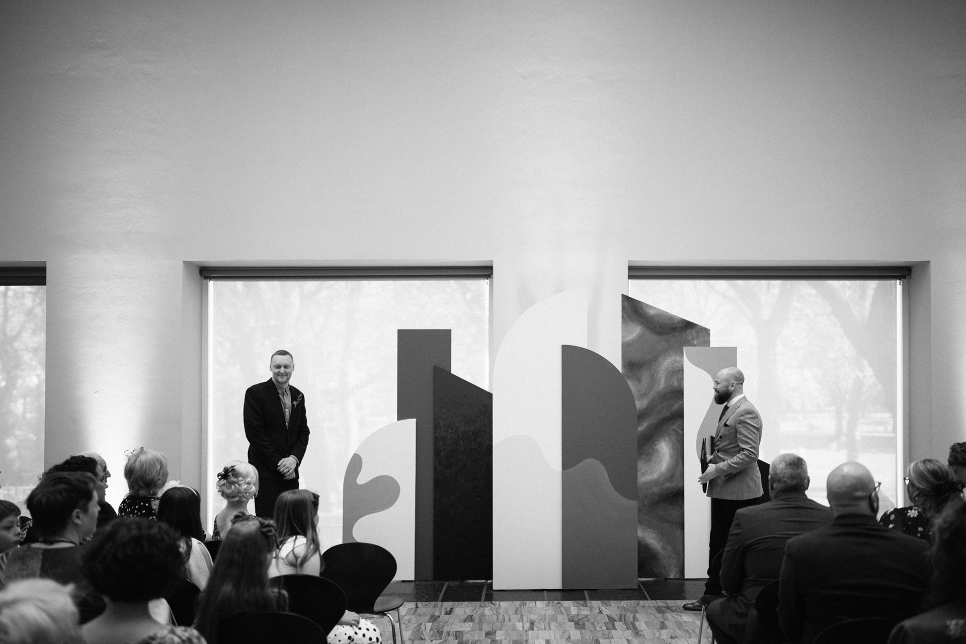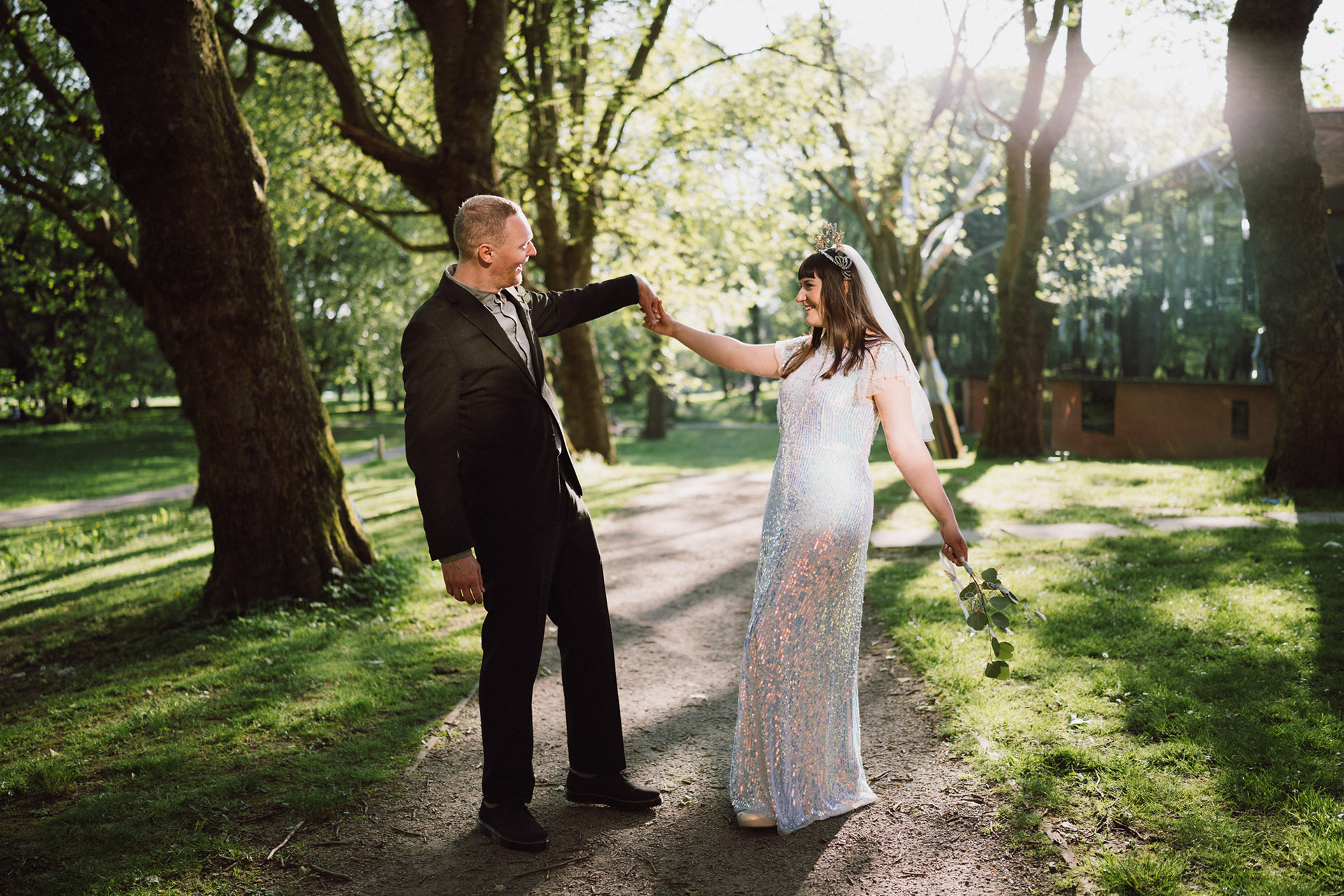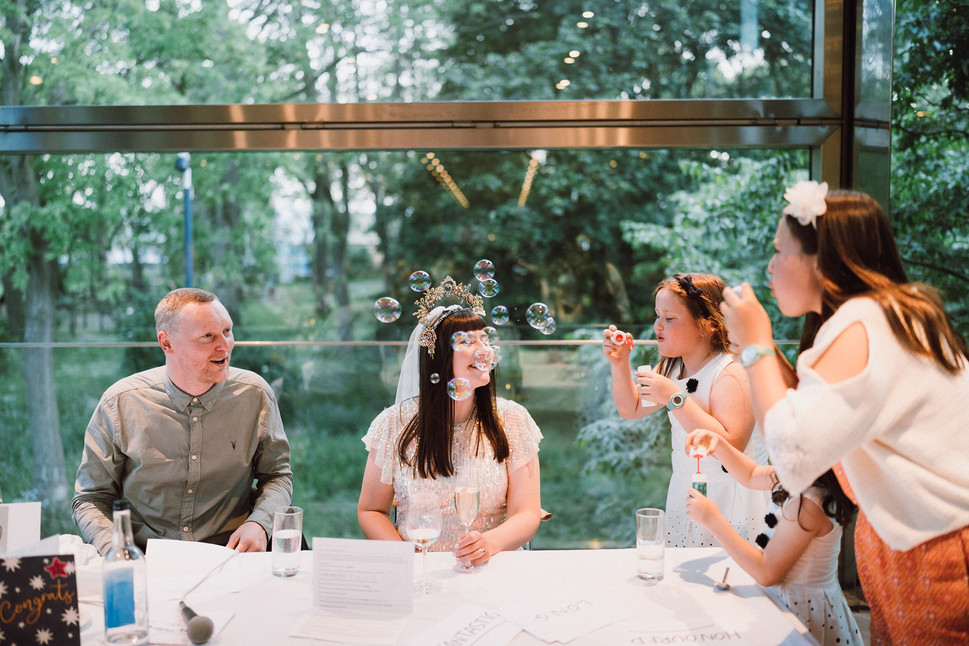 The park adjacent to the Gallery offers a convenient and picturesque environment. We were lucky enough to have the sun bouncing off the reflective steel of one of the sculptures next to the building, creating a puddle of brilliant light for Amy and Ian to be photographed in. The impressive glazed dining room played host to an incredible meal alongside heart felt and humourous speeches before the dancing got underway.