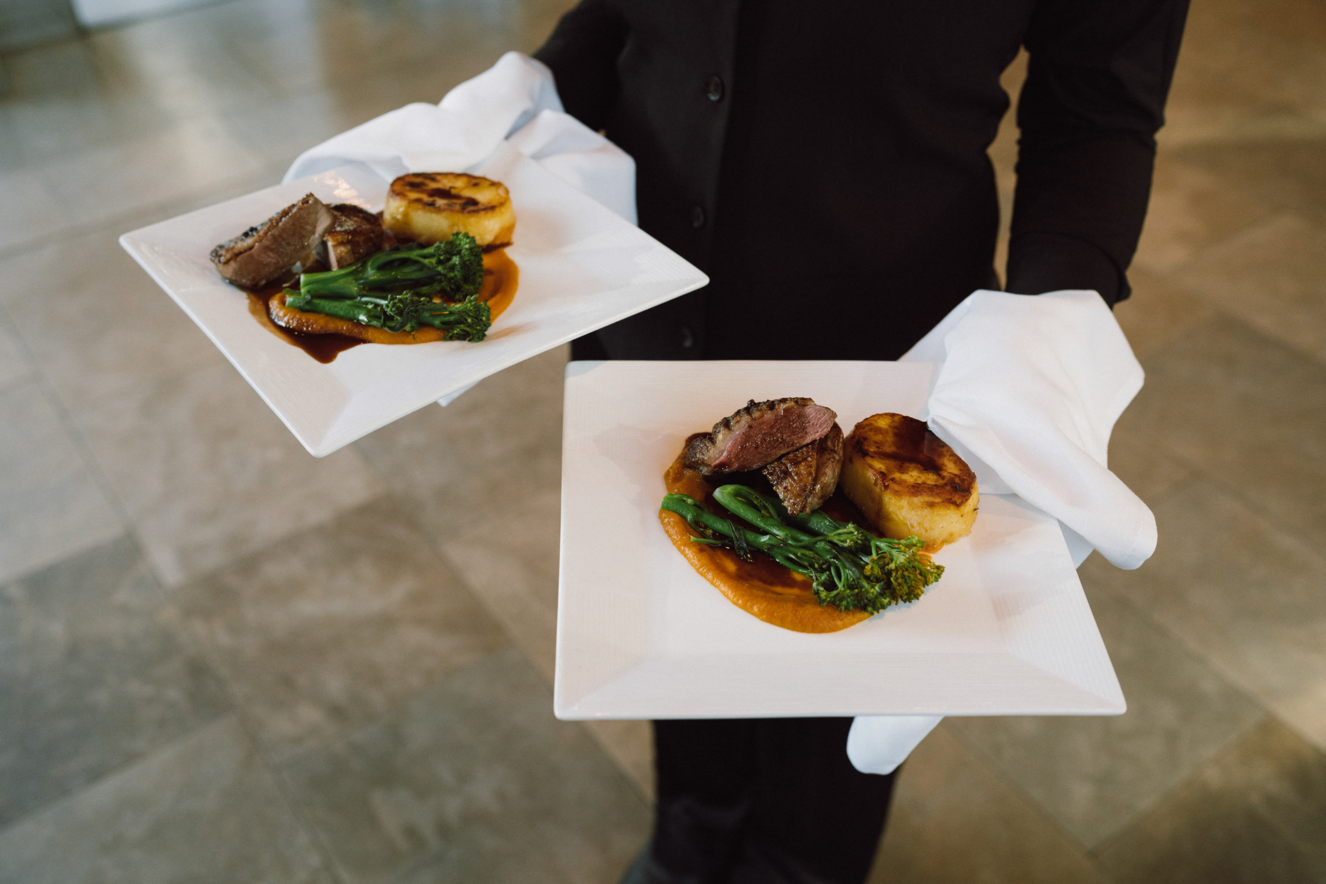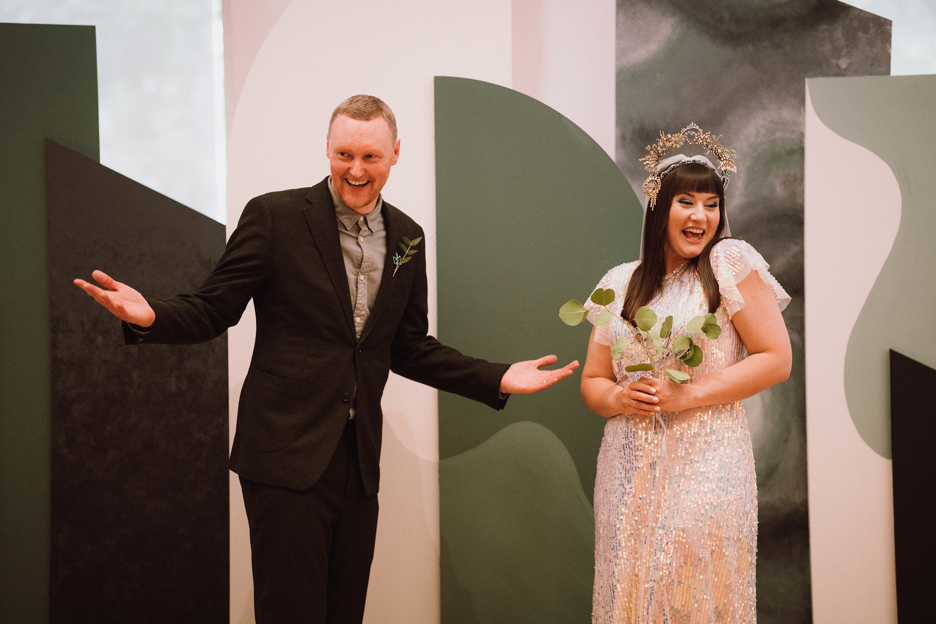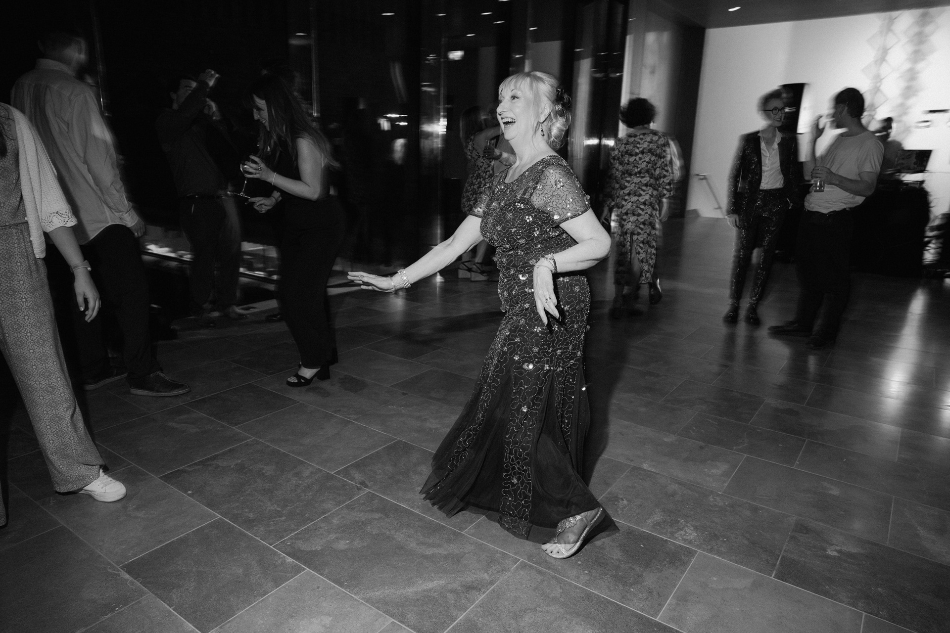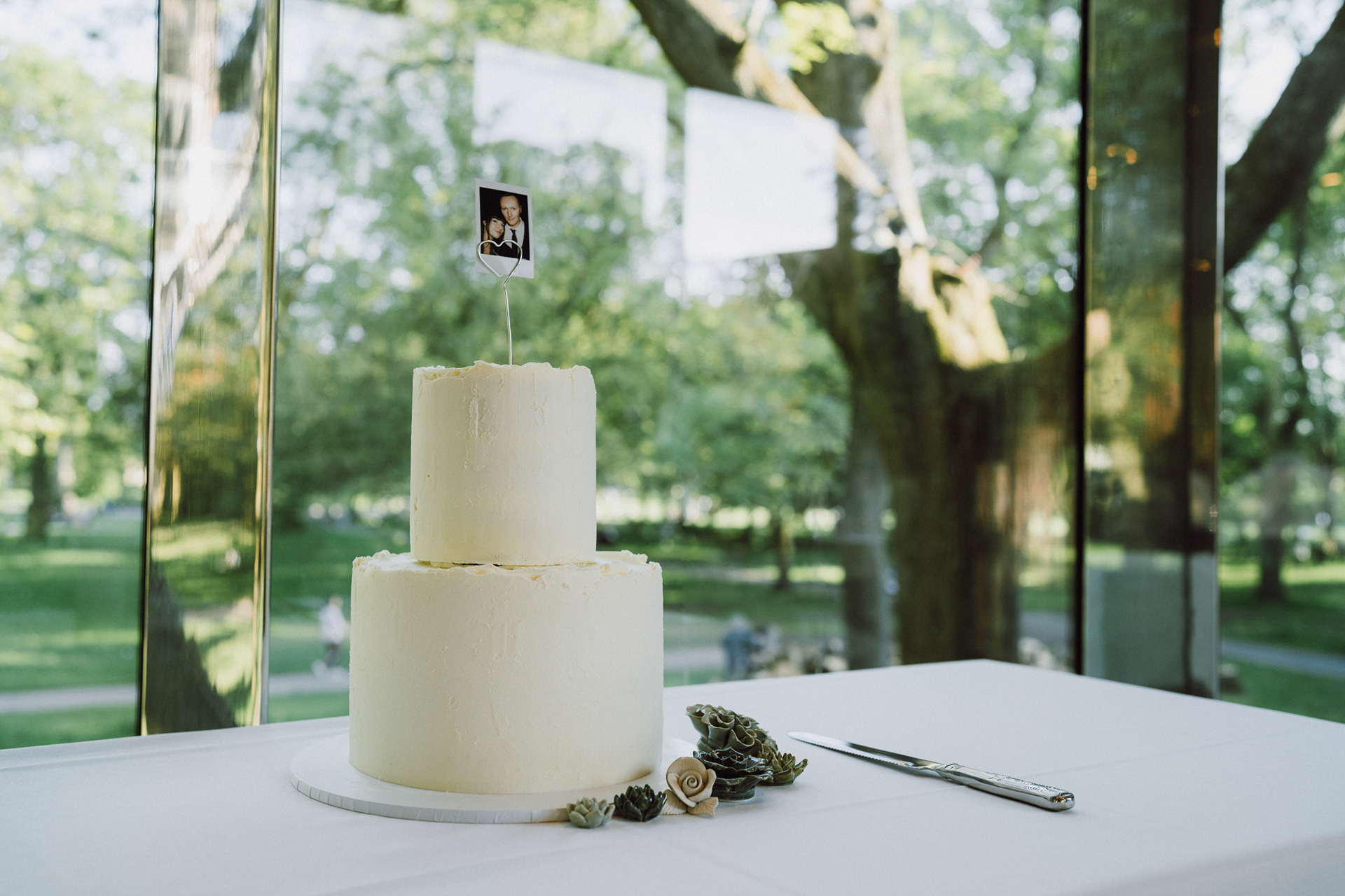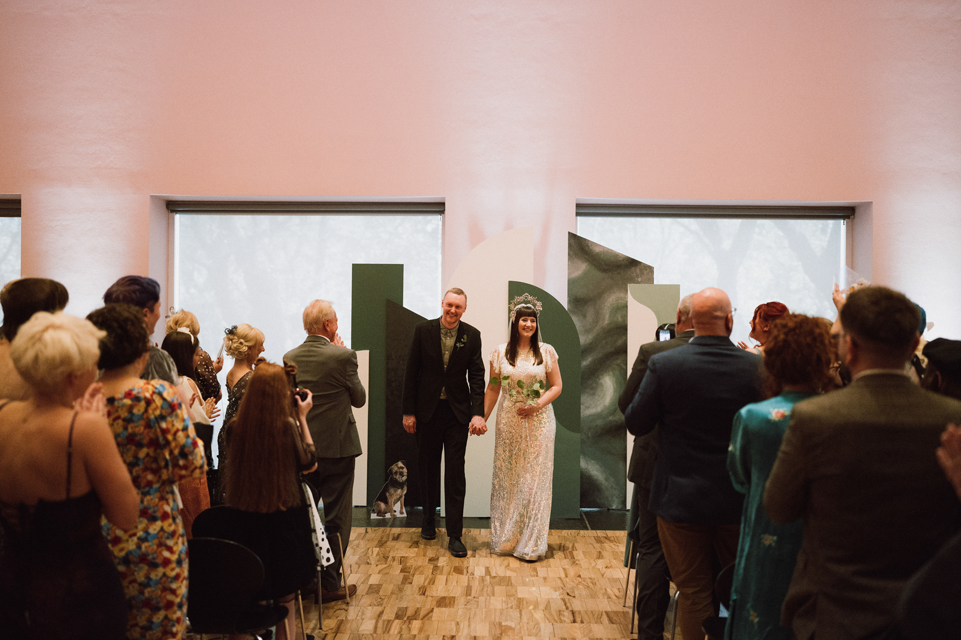 The park adjacent to the Gallery offers a convenient and picturesque environment. We were lucky enough to have the sun bouncing off the reflective steel of one of the sculptures next to the building, creating a puddle of brilliant light for Amy and Ian to be photographed in. The impressive glazed dining room played host to an incredible meal alongside heart felt and humourous speeches before the dancing got underway.